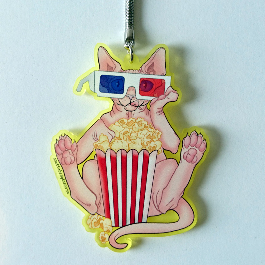 Akryl nyckelring med tryck av Sphynx katt med 3D glasögon och popcorn.